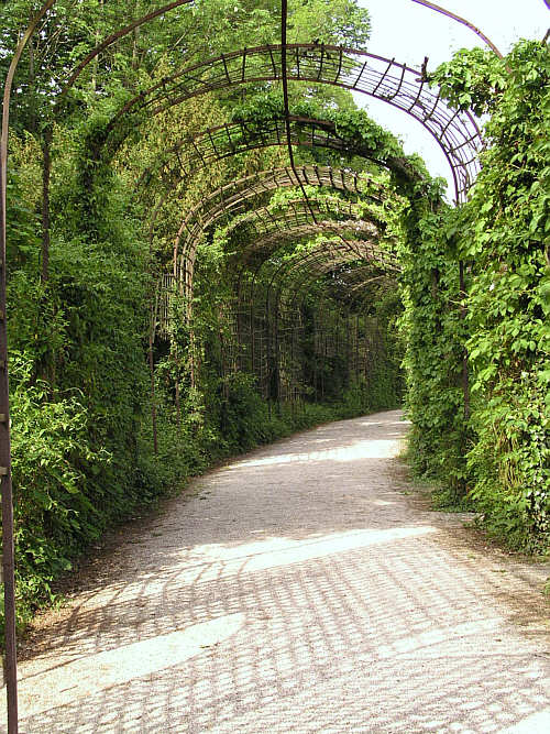Viertelkreisförmige Laubengänge als Entsprechung der Zirkelbauten auf der Gartenseite des Parterres