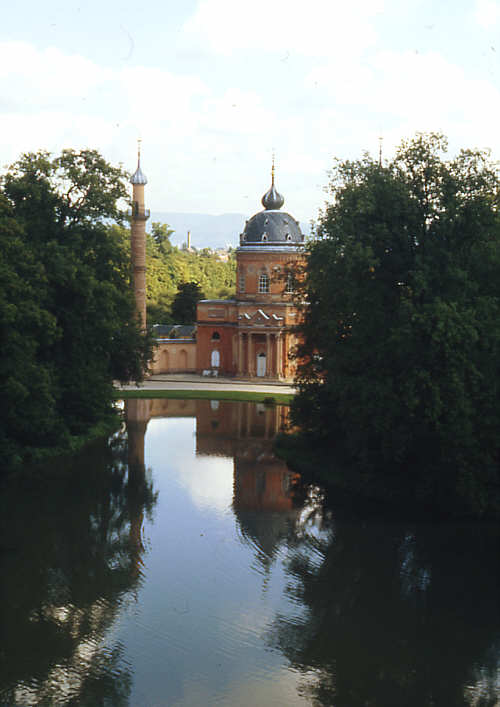 Blick vom Hügel des Merkurtempels über den Kleinen Weiher zur Moschee