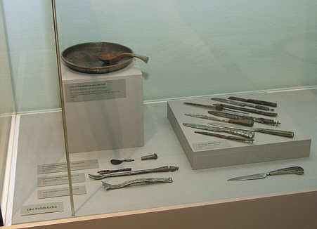 , davor Löffel, Gabel und Pfannengriff, rechts Messer.