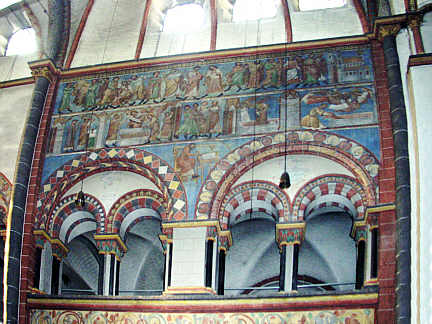 Fresko an der Nordostwand des Langhauses Darstellung des Lebens des heiligen Severus von Ravena. Ganz unten zwischen den beiden Arkadenbögen der Heilige, Patron der Weber, Tuchmacher udn Polizisten, bei der Arbeit am Webstuhl.