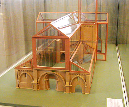 Rekonstruktion der Gebäudes; die bestehenden Reste der Kirche sind plastisch ausgearbeitet.