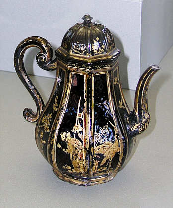Schwartz Porcelain Kaffeekanne Meißen, 1710-1713 Böttgersteinzeug, schwarz glasiert, Dekor in Gold- und Lackmalerei London, Privatsammlung
