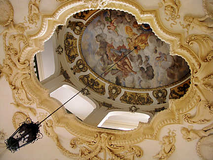 Deckendurchbruch über den Treppen, der mit seinem Fresko die Illusion eines Blicks in den Himmel erzeugt.