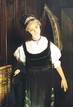 Mieder mit weißer Leinenbluse, dazu eine Bodenhaube mit goldbesticktem Steg