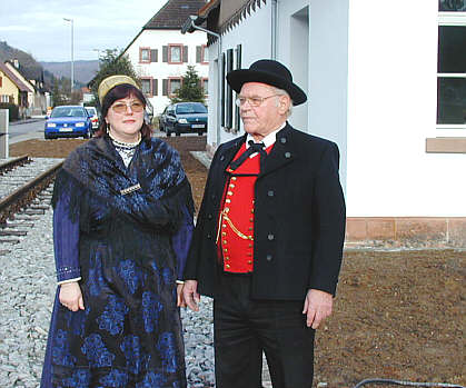 Bestandteil der Frauentracht ist die Goldhaube, wie sie auch im benachbarten Kinzigtal getragen wird. Der Mann trägt zumschwarzen Anzug die typische Schwarzwälder rote Weste aus Wollstoff.