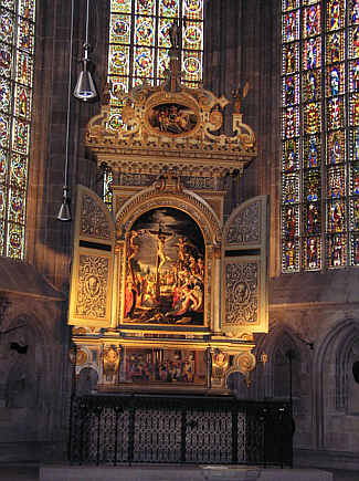 Hochaltar von Peter Riedliger aus Ravensburg, 1604, mit gemalten Szenen aus dem Leben Christi