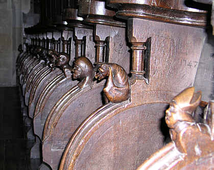 Geschnitztes Chorgestühl von Hans Weck und Anton Buol, 1518 Detail: Figuren zwischen den Sitzen.
