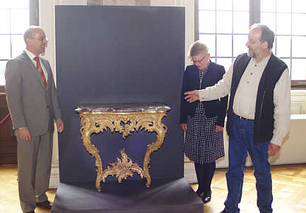 und Restaurator Thomas Merkl bei der Präsentation der Konsoltische