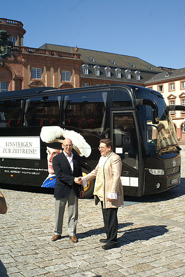 Der neue Schlösserbus aus dem Haus Barbis vor dem Mannheimer Schloss,