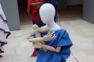 Ende Juni öffnete die Sonderausstellung „Vom Schaf zur Tunika“ ihre Türen für die Besucher. Die Ausstellung beschäftigte sich mit dem Rohstoff Wolle und dem Herstellungsprozess von Textilien in römischer Zeit. Originalfunde aus dem Kastell wie Spinnwirtel und Webgewichte gaben Einblicke in die Gewerke des Spinnens und Webens – wichtige Arbeitsschritte, die ein Wollflies durchläuft, bis es zum fertigen Gewand wird. Repliken wie ein Gewichtswebstuhl erschlossen einzelne Arbeitsschritte und halfen, antiken Techniken auf die Spur zu kommen. Ein Ankleidezimmer, in dem die Besucher sich in Toga oder Palla einkleiden konnten, bildete den Abschluss der Ausstellung. Die großformatigen Bilder mit Porträts von Schafen der Malerin Barbara Focke gaben der Ausstellung einen prächtigen und beziehungsreichen Rahmen. Ein vielfältiges Rahmenprogramm bot den Besuchern – besonders den Kindern – Gelegenheit, verschiedene einfache Techniken der Textilherstellung auszuprobieren.