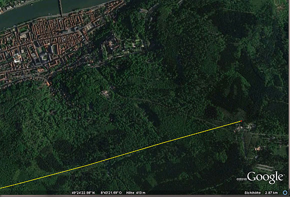 Ein kurzer Blick auf die Landkarte bei Google Earth zeigt allerdings, dass das, was man durch bloßen Augenschein im Schwetzinger Schlosshof schon erkannt, auch tatsächlich so ist: Die Achse zielt exakt auf den höchsten Punkt des Königstuhls. Das dürfte in dieser Ausrichtung das Werk des Kurfürsten Ludwig V. (1508 - 1544) sein, der 1527 seinen Jagdturm nach dem "Parnass", dem Götterberg der Humanisten ausrichtete.