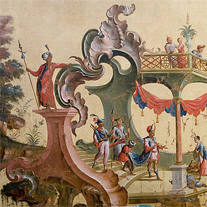 Unten: Leinwandtapete mit Chinoiserieszenen aus der Zeit um 1755 aus dem Herrenhaus Zehmen. Leipzig, Grassi Museum für angewandte Kunst (Förderprojekt der Deutschen Stiftung Denkmalschutz). Foto © Roland Rossner, Deutsche Stiftung Denkmalschutz .