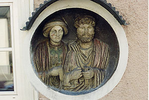 Römisches Grabmedaillon, 2.Hälfte 2.Jh.n., eingemauert in der Fassade des Hauses Stadtplatz 18 in Wels