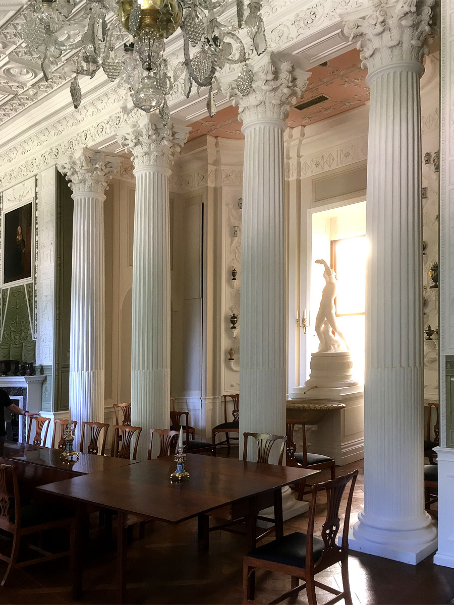 Das Schloss gilt als der erste Schlossbau des Klassizismus in Deutschland, ist aber gleichzeitig mit dem Badhaus des Kurfürsten Carl Theodor in Schwetzingen entstanden. Die Architektur ist wahrhaft klassisch, der Säulenportikus erinnert tatsächlich an palladianische Villen im Veneto. Viel Liebe zum klassischen Säulendekor auch im Innern, ganz nebenbei aber auch eine sehr schöne und sehr feine Seidentapete im chinesischen Stil. Der Fortschritt der Zeit zeigt sich in einem als klassizistisches Postament verkleideten Eisschrank und in einem handbetriebenen Speiseaufzug.