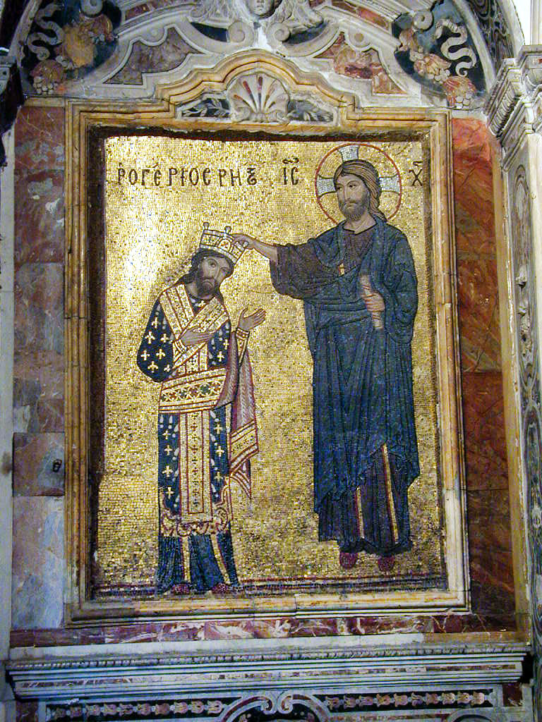 Krönungsmosaik des normannischen Königs Roger II. in der Chiesa della Martorana, Palermo.