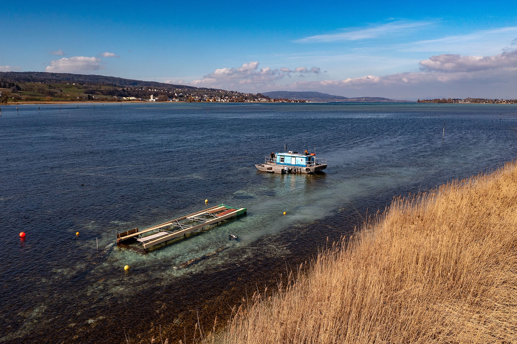 Blick Richtung Schweizer Ufer, Strömungsschild um den Einbaum, hinten NABU-Arbeitsboot Netta