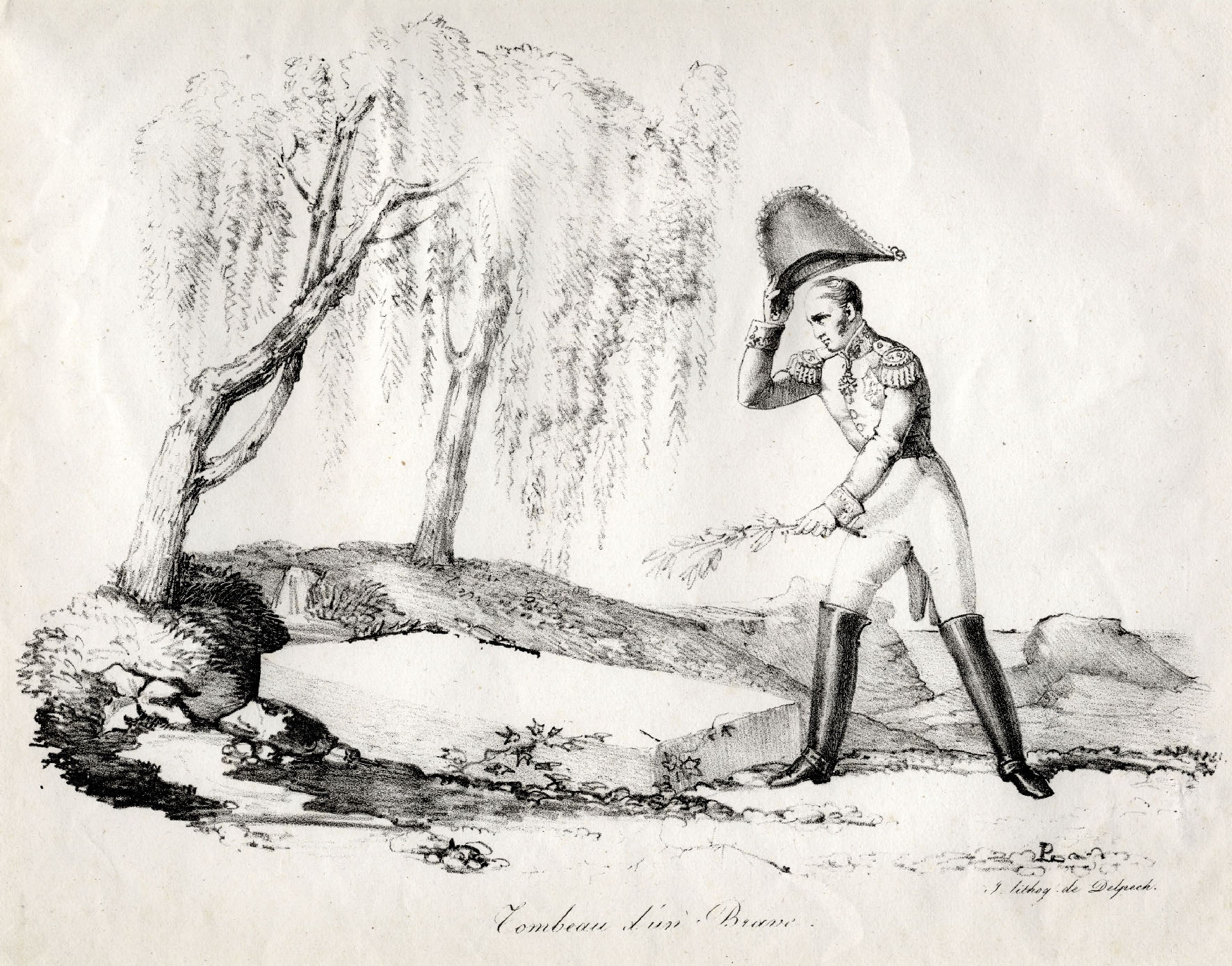 "Das Grab eines Tapferen", Lithographie von Delpeche nach 1821. Der Stich zeigt einen französischen Offizier, der mit einem Lorbeerzweig in der Hand zum Grab Napoleons I. geht. Die Lage in der Landschaft zeigt eindeutig das Grab von Sankt Helena: am Fuße eines Hügels, neben einer Quelle, unter einer Trauerweide. Also genau die (auch) auf Arenenberg kopierte Situierung. Bild: Nepoloenmuseum