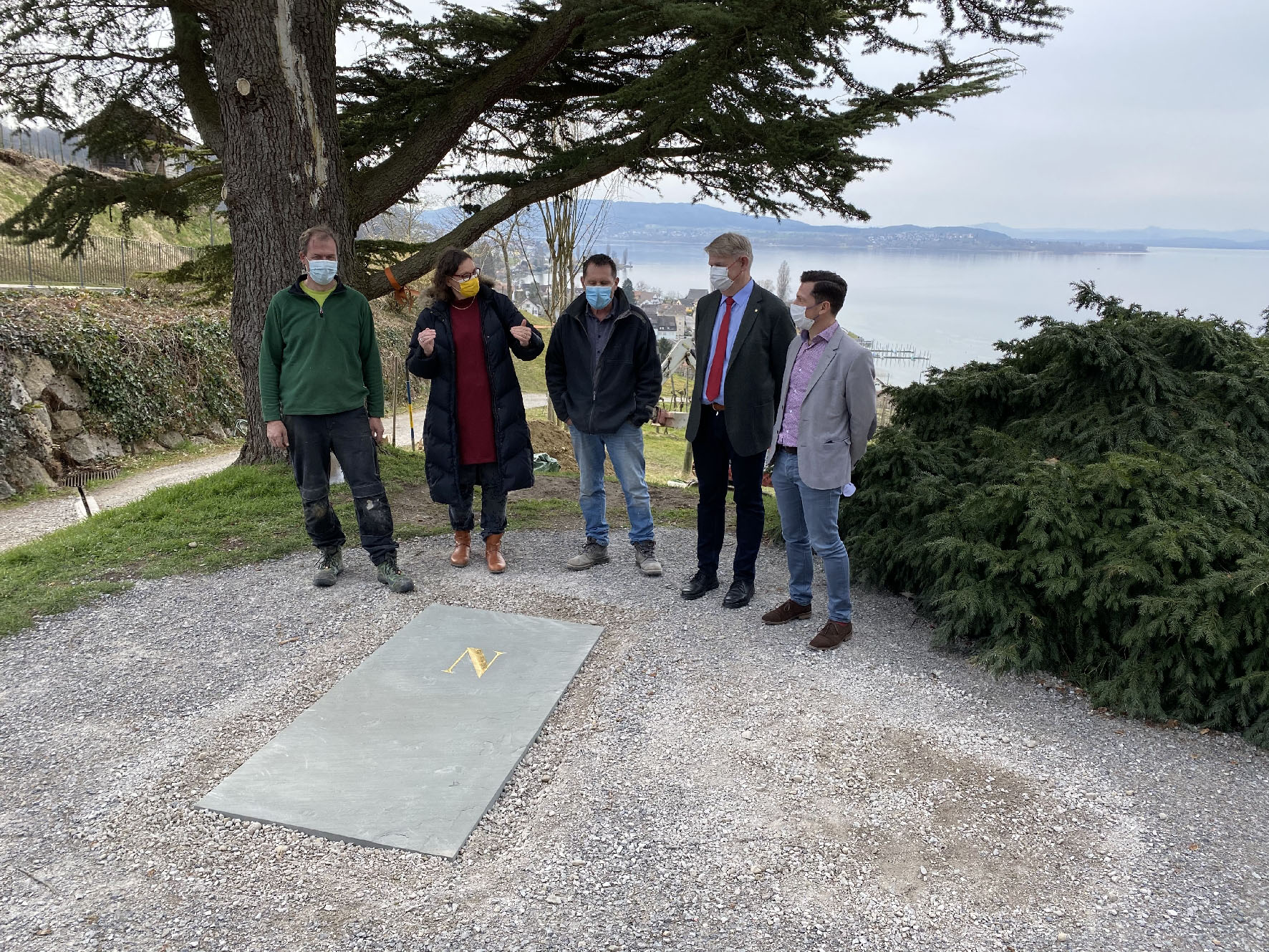 Nach der Setzung des Napoleongrabs auf dem Arenenberg (v.l.): Daniel Brogle, Betriebsleiter der Arenenberger Gärtnerei, Christina Egli, stv. Direktorin des Napoleonmuseums, Steinmetz Urs Traber, Dominik Gügel, Direktor des Napoleonmuseums und Peter Zadravec, Leiter Servicecenter Arenenberg. Bild: pr2