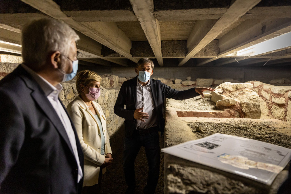 Darunter: Ministerin Nicole Razavi MdL (Mitte) besucht die archäologischen Grabungen in Unterregenbach gemeinsam mit dem Präsidenten des Stuttgarter Regierungspräsidiums Wolfgang Reimer (links) und dem Präsidenten des Landesamts für Denkmalpflege Prof. Dr. Claus Wolf (rechts).