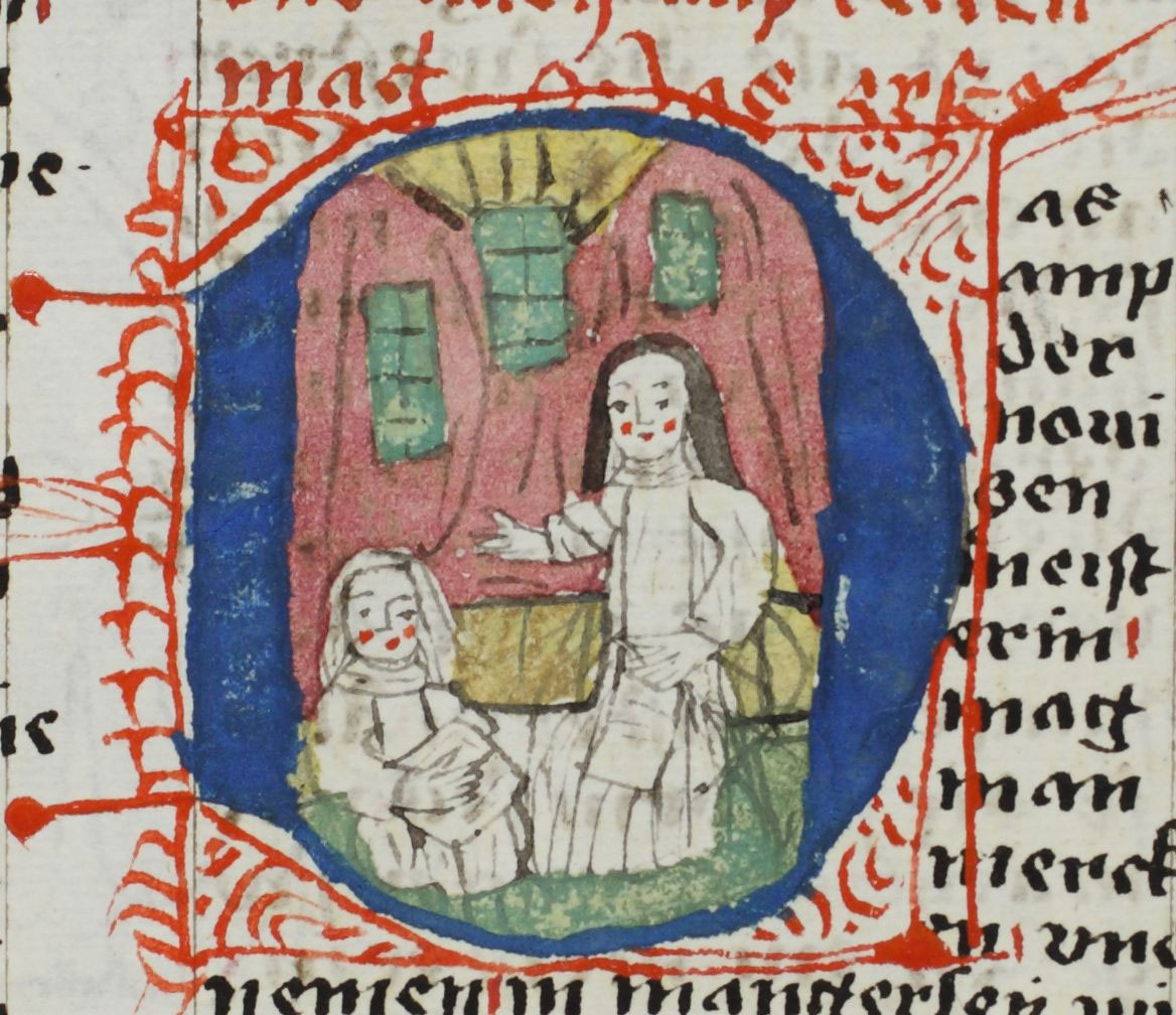 Initiale: Darstellung der Novizenmeisterin im Leipziger Exemplar des Ämterbuches von Johannes Meyer (Universitätsbibliothek Leipzig, MS 1548, fol. 60r)