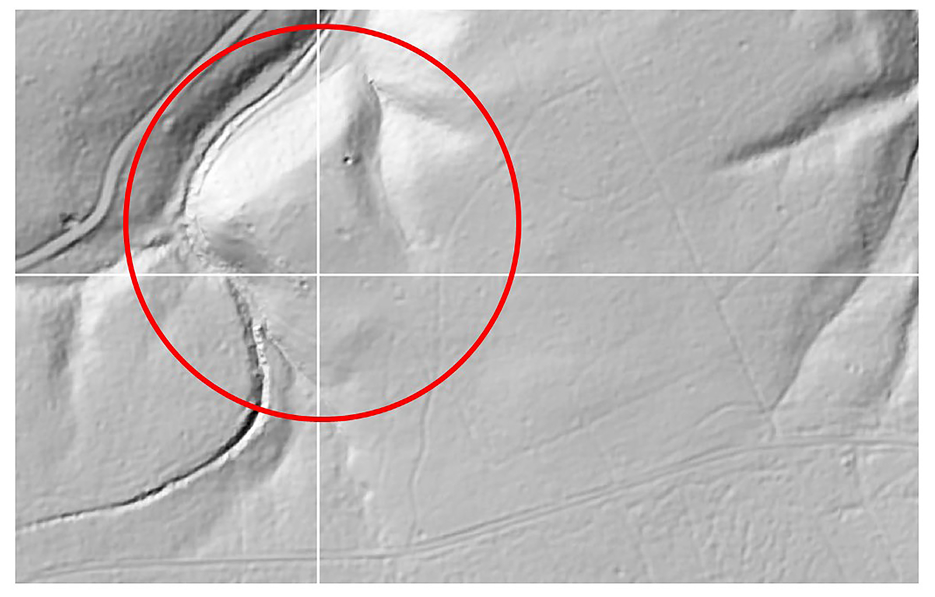 Unten: Lidarscan der Pfalz Bodfeld. Zu erkennen ist die trapezförmige Anlage der Pfalz in Spornlage oberhalb des Trecktals (zwischen Heimburg und der Elbingerröder Hochfläche). Landesamt für Geographie und Vermessung Sachsen-Anhalt.