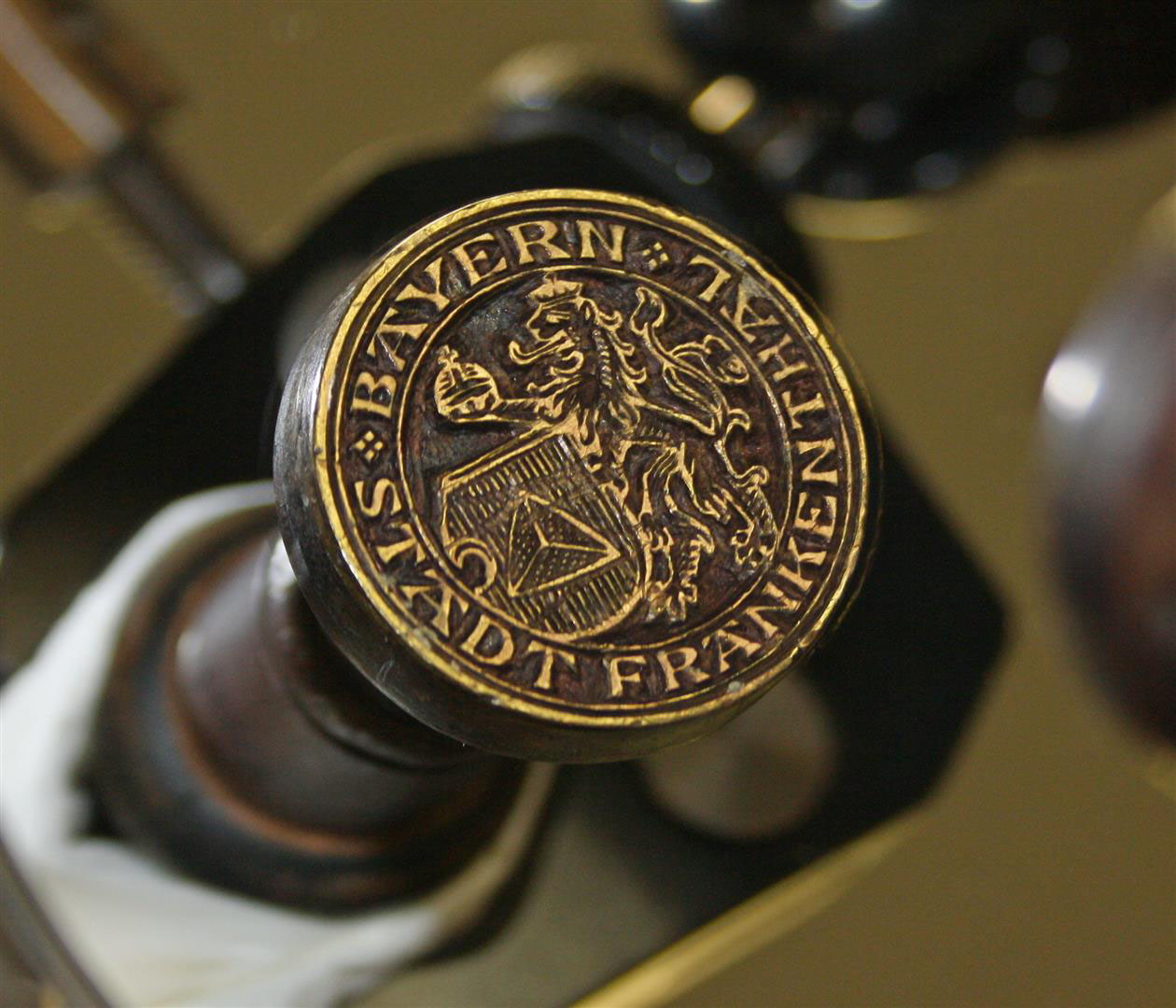 Stadtsiegel werden auch heute noch für die Beurkundung und Beglaubigung wichtiger Dokumente verwendet. Das aktuelle Frankenthaler Stadtsiegel kommt zum Beispiel bei der Verleihung der Bürgerplaketten zum Einsatz. Das jeweilige Stadtwappen ist natürlich zentrales Gestaltungsmerkmal eines Stadtsiegels. In Frankenthal ist dies ein bezungter und bekrönter Löwe, der in der erhobenen rechten Tatze einen goldenen Reichsapfel und mit der linken ein Schild trägt. Im Schild ist ein dreieckiger, mit der Spitze nach oben gekehrter goldener Eckstein zu sehen. Das Stadtwappen wird im gezeigten Objekt von der Umschrift „Stadt Frankenthal Bayern“ eingefasst. Frankenthal fiel wie große Teile der linksreinischen Pfalz 1816 vertraglich dem Königreich Bayern zu, nachdem die napoleonischen Truppen besiegt und die territoriale Neuverteilung durch den Wiener Kongress und Nachverhandlungen geregelt war. Bis 1946 das Land Rheinland-Pfalz gegründet wurde, blieb Frankenthal in der Folge verwaltungstechnisch ein Teil Bayerns.