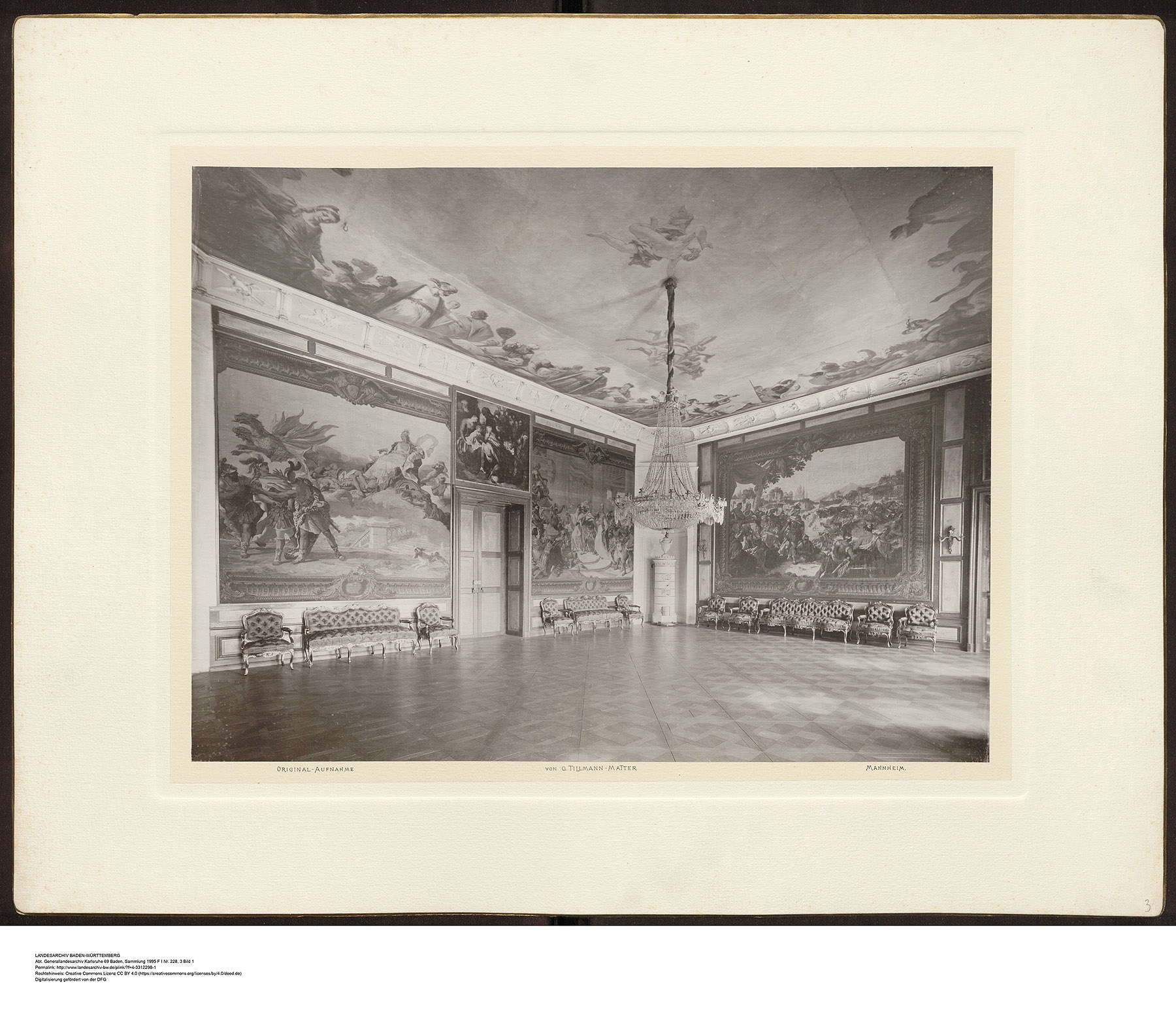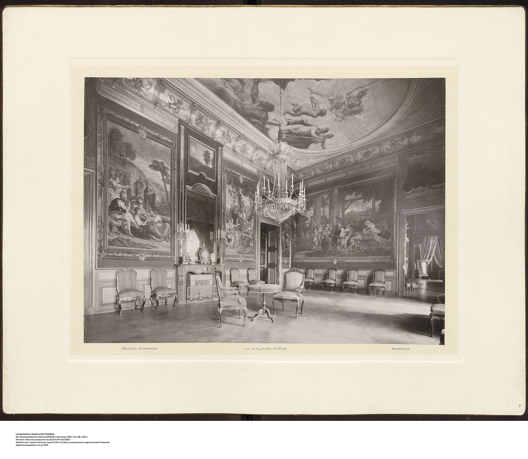 Die Arbeiten Giovanni Antonio Pellegrinis befanden sich in den Prunkräumen des Kaiserlichen Quartiers im östlichen Flügel des Hauptgebäudes. Da Kurfürst Carl Philipp sparen musste, wurde dieses Appartement erst mehr als 10 Jahre nach der Einrichtung der Appartements im westlichen Teil der Beletage ausgestattet. Die Raumfolge ist zu Ehren von Kaiser Karl VII. benannt und umfasste die prächtigsten und hochrangigsten Räume im Schloss. Der Herrscher war der erste Wittelsbacher auf dem Kaiserthron seit dem Mittelalter – und auch der letzte bis zum Ende des Heiligen Römischen Reichs Deutscher Nation. Die Ausstattung spiegelt die kurpfälzischen Ambitionen der Zeit wider: Im Januar 1742 besuchte Kurfürst Karl Albrecht von Bayern Mannheim auf seiner Reise nach Frankfurt, wo er als Karl VII. zum Kaiser gekrönt wurde. Pellegrinis Malereien waren ein wichtiger Teil der herrschaftlichen Inszenierung der Wittelsbacher – so war an der Decke des Thronsaals etwa der „Triumph der Palatia“ zu sehen, die die Kurpfalz verkörpert.