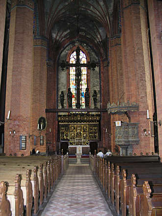 Innen zeigt sich die Kirche St. Marien als dreischiffige vierjochige Backsteinhalle mit Achteckpfeilern und Sterngewölben.