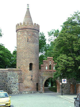 Spätgotischer Turm der Stadtbefestigung neben einer kleinen Pforte, kegelförmiger Helm von 1845