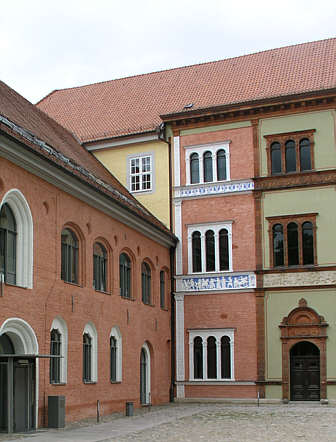 zweigeschossiger, im 19. Jh. stark veränderter Backsteinbau.