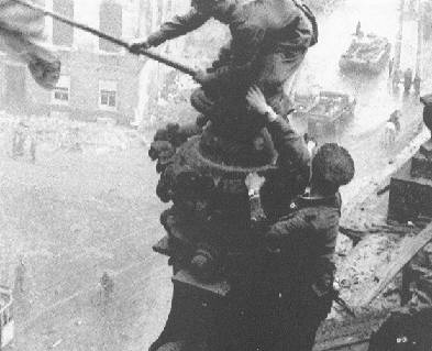 Sowjetische Soldaten hissen in der Stunde des Sieges die Rote Fahne auf dem Berliner Reichstagsgebäude |