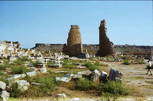 Eines der Hauptbauwerke der Stadt ist die hufeisenförmige Toranlage aus hellenistischer Zeit, die von zwei Rundtürmen flankiert wurde. Sie wurde 120 - 122 n. Chr. durch Plancia Magna, die Tochter den Gouverneurs von Bithynien, Plancius Varus, prächtig ausgestattet. | |||||||||