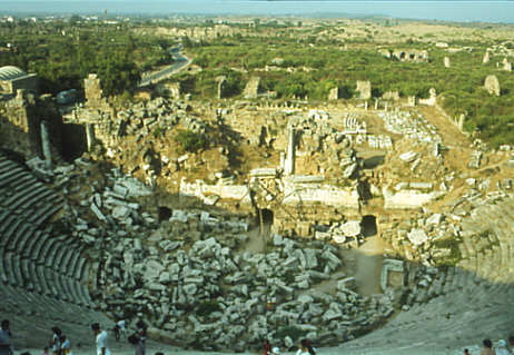 Das Theater von Side, errichtet in der Mitte des 2. nachchristlichen Jahrhunderts in der Tradition römischer Bauten. | ||||||||