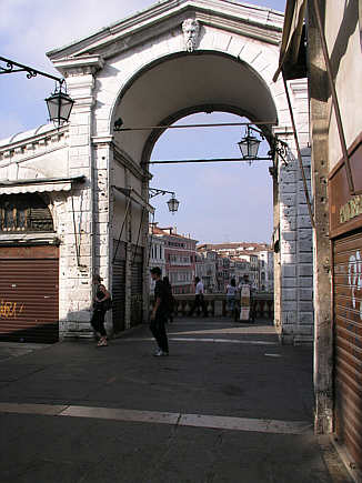 Arkade auf dem Scheitel der Brücke, links eines der Ladengeschäfte, zu dieser frühen Morgenstunde noch geschlossen.