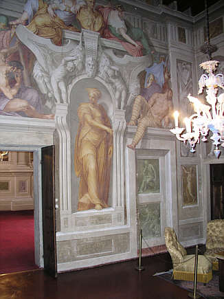 Fresko von Gianbattista Zelotti: Nischen mit gemalten Bronzestatuen, rechts eine typische illusionistische Szene, die mit der Perspektive spielt.