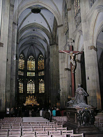 Mittelschiff zum Chor Mittelschiff mit 32 m Höhe, von den 17 m hohen Seitenschiffen durch Spitzbogenarkaden abgeteilt. Mittelschiffwölbung im gebundenen System. Der Chor mit Drei-Achtel-Schluss und großen Maßwerkfenstern.