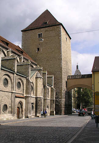 "Heiden-" oder "Römerturm", für dessen stauferzeitlichen Sockel vermutlich Steine der römischen Befestigungen verwendet wurden. Untergeschoss aus dem 13., Obergeschos sin Bruchstein aus dem 14. Jh.