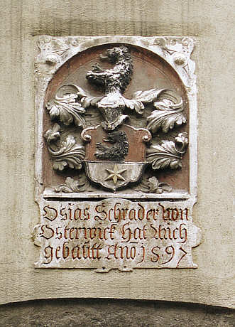 Wappen Wappenschild mit der Aufschrift "Osias Schrader von Osterwick hat mich gebaut Anno 1597" am nördlichen Anbau des Reichsaals (Fürstliches Nebenzimmer).