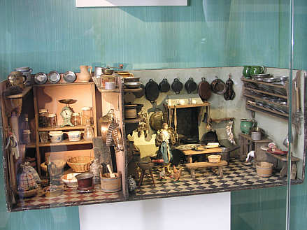 Puppenküche mit Vorratskammer links, Mitte 19. Jahrhundert An der Wand stehender gemauerter Herd, offenes Geschirrregal