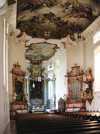 eingezogenem Chor gehalten. An der Decke des Langhauses sind Freskomalerei von Nikolaus