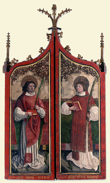 Die Heiligendarstellungen dieses Altars verweisen mit den Frankenaposteln eindeutig auf das Bistum Würzburg: Im Schrein stehen die Figuren des hl. Kilian, des hl. Burkart und des hl. Hieronymus, auf den Flügeln sind im Relief der hl. Christophorus und die hl. Dorothea zu sehen, auf den Flügelaußenseiten finden sich gemalt der hl. Kolonat und der hl. Totnan. Der Heilige Kilian brachte mit seinen Gefährten Kolonat und Totnan der Legende nach den christlichen Glauben nach Franken. Hier werden die drei Gefährten bis heute hoch verehrt und sind die Hauptheiligen des Bistums Würzburg. Der Altar ist laut Datierung um 1470 entstanden, also in der Generation, bevor Tilman Riemenschneider nach Würzburg kam.