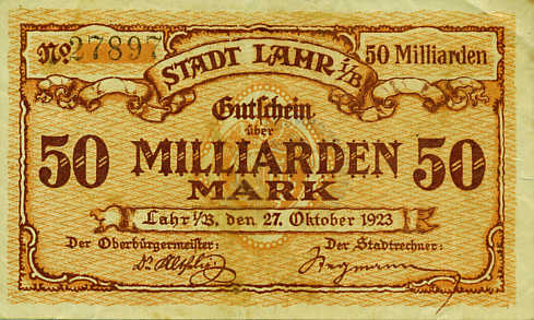 | Notgeld der Stadt Lahr 27. Oktober 1923 Gutschein über 50 Milliarden Mark Rückseite: unbedruckt. Stempel "Stadtverrechnung Lahr (Baden)" |