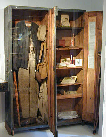 Wandschrank mit der "Uniform" eines 1953 heimkehrenden Kriegsgefangenen, daneben die in der lagerhaft angefertigten Gegenstände