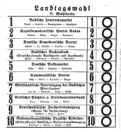 Stimmzettel zur Landtagswahl in Baden im August 1925