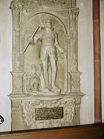 Standbild im Renaissance-Rahmen, getragen von zwei Säulen auf Podesten. Das Standbild des Toten selbst in Rüstung, der Helm abgelegt zu Füßen.