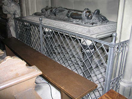 Hochgrab in zwei Etagen; unter der Liegefigur des Toten im bischöflichen Ornat ein ehernes Skelett, das auf die vergänglichkeit aller irdischen Würden hinweist.