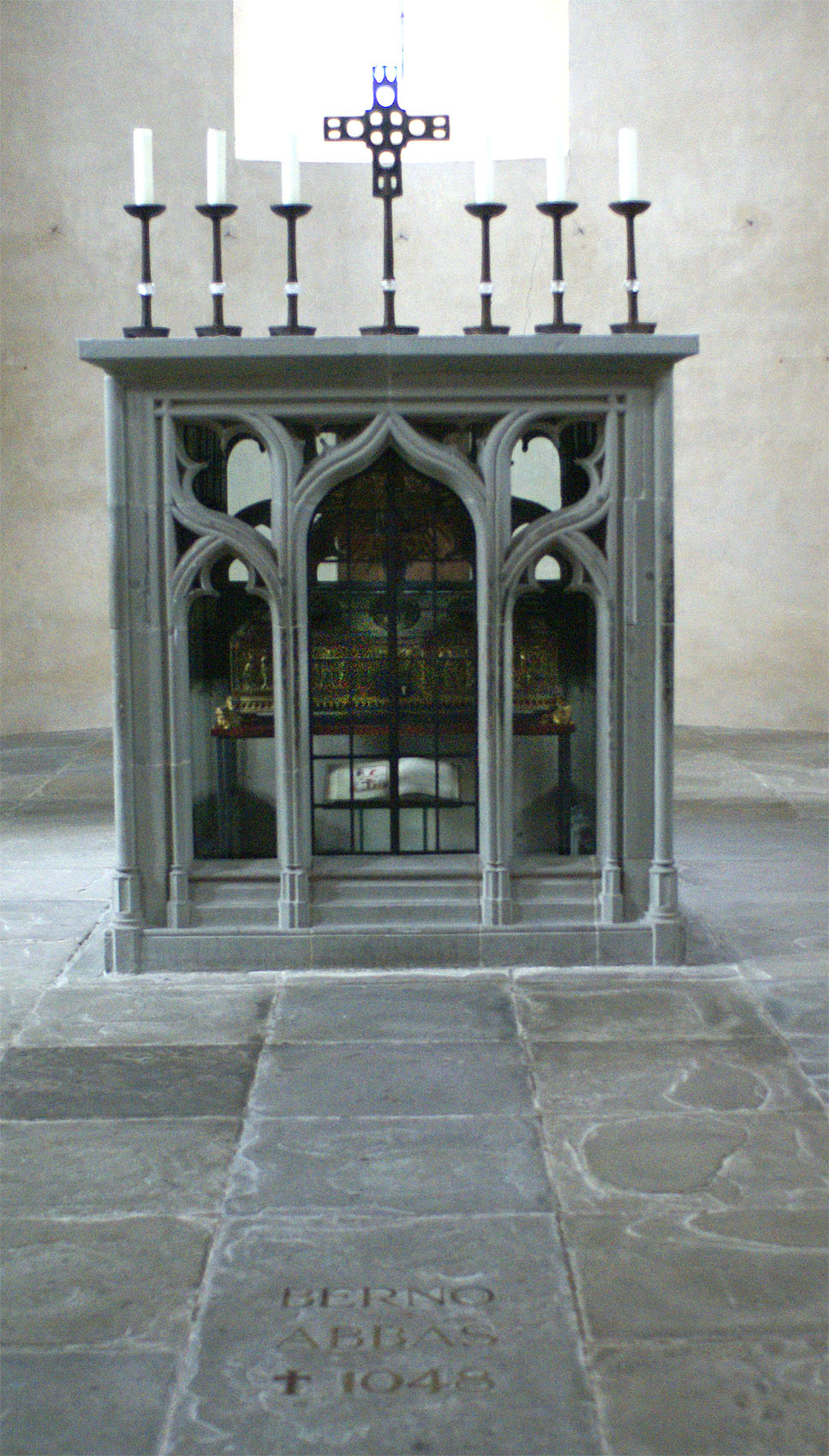 Bild links: Frontseite des Markusaltar, im Bildvordergrund die Grabplatte des Abtes Berno, + 1048