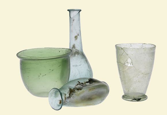 Zwei Glasbecher, ein Balsamarium sowie ein Balsamarium mit