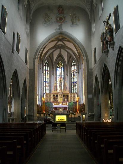 Der gegenwärtige Bau des Münsters Unserer Lieben Frau wurde 1436 an der Stelle einer romanischen Vorgängerkirche begonnen, die ihrerseits am Platz der Kirche des Bischofs Ratold stand.Der Bau ist eine dreischiffige Basilika mit spitzbogig geschlossenen Arkaden auf Achteckpfeilern und einem polygonal geschlossenen Chor.