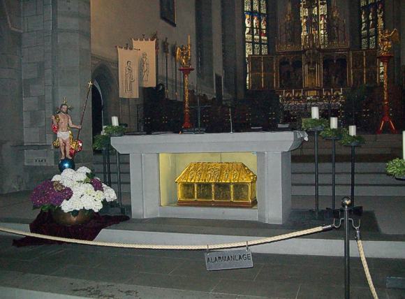 Im Zelebrationsaltar steht der Schrein mit den Reliquien der "Hausherren", der Stadtpatrone Theopont und Senesius (14./15. Jh.). Für die Reliquien von St. Zeno, dem Mit-Patron der Stadt, ist in der Zeno-Büste (ca. 15. Jh.) ein würdiger Platz geschaffen.